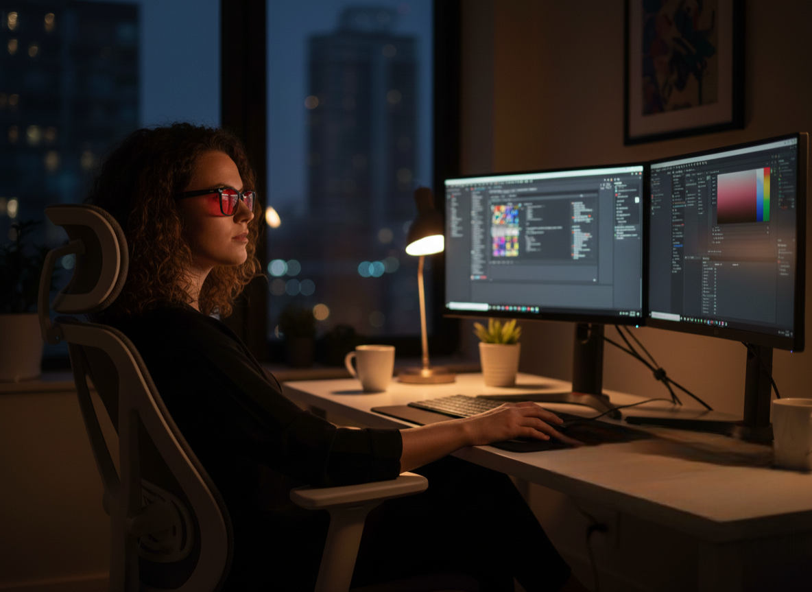 העדשה האדומה מסננת כמעט 99% מהאור הכחול, במיוחד בשעות הערב. זה מאפשר לעיניים להירגע מהר יותר ומפחית עומס לפני השינה.