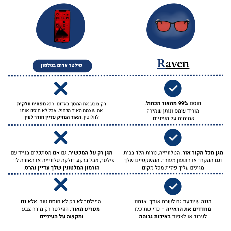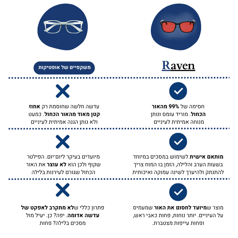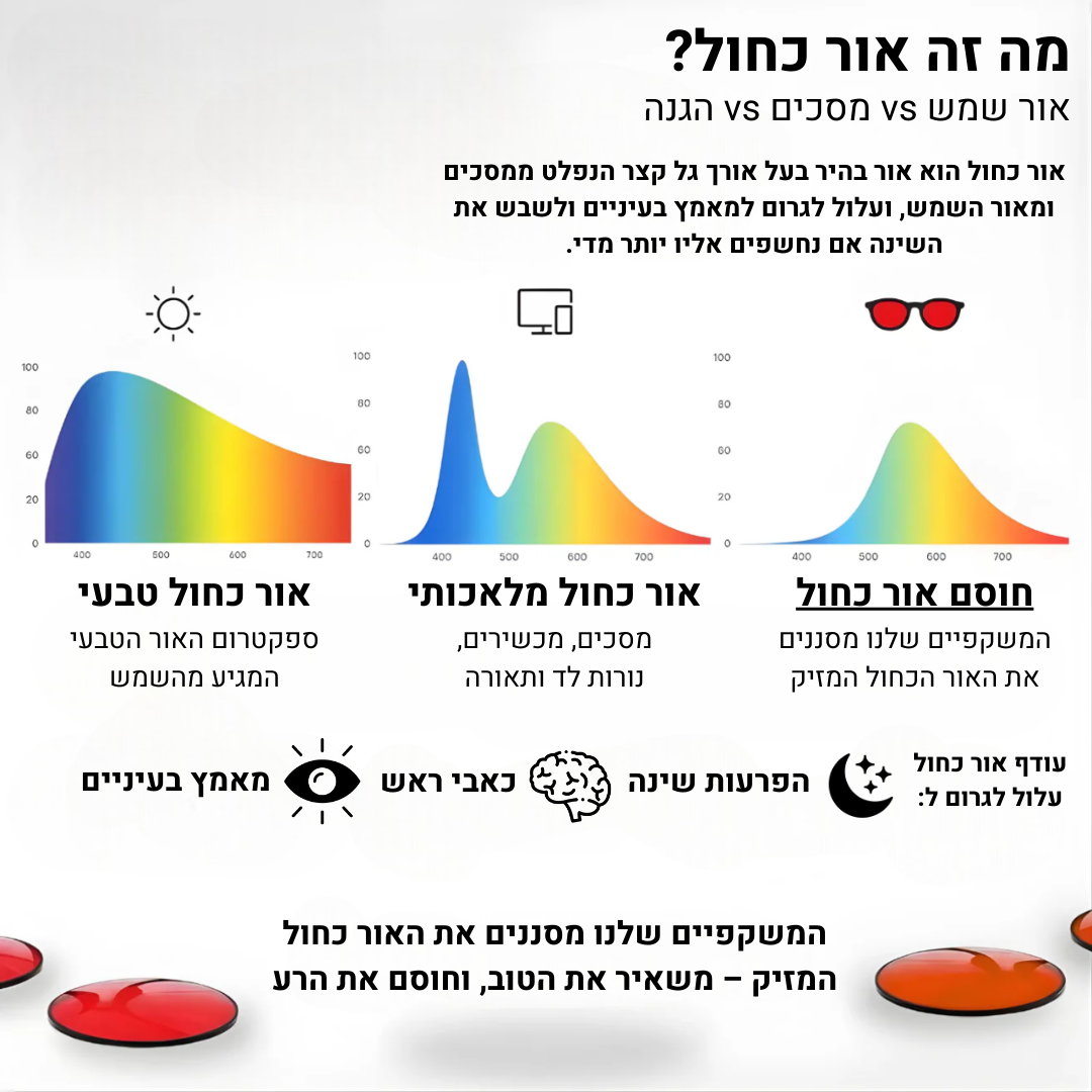 מחקרים מראים שחשיפה ממושכת לאור כחול - מהטלפון, מהמחשב או אפילו מהטלוויזיה – יוצרת עייפות, כאבי ראש, ירידה בריכוז, חוסר חדות מחשבתית ופוגעת בתאי העיניים (שדרך אגב -לא מתחדשים). היא מפריעה לשינה טבעית, כך שהגוף לא מתחדש, האנרגיה יורדת, המוטיבציה נעלמת, וכל יום כזה מצטבר והופך את החיים לקשים יותר - גם אם לא שמתם לב.